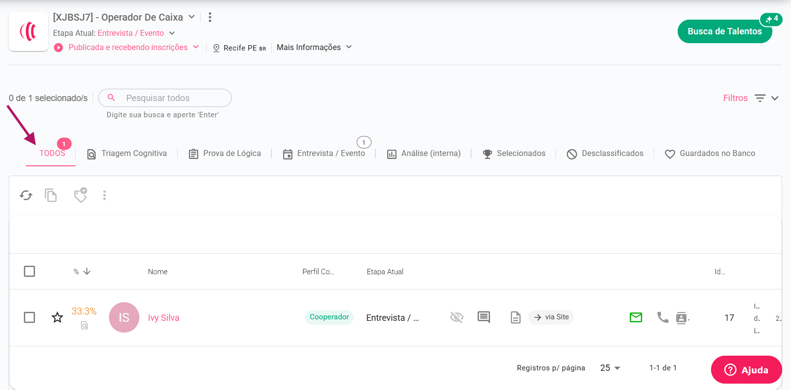 Localizado abaixo do título da oportunidade, esse campo permite procurar candidatos pelo nome, e-mail, CPF ou Cidade.