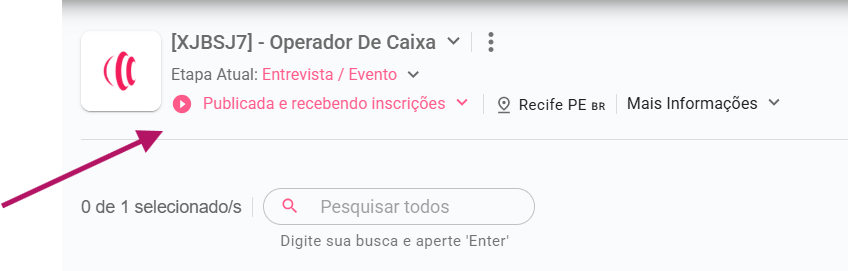 Próximo ao título da oportunidade, há uma seta apontando para baixo. Ao clicar nela, será exibida uma lista com todas as oportunidades publicadas, incluindo aquelas que estão pausadas para novas inscrições. Assim, você pode alternar entre processos seletivos com apenas um clique.