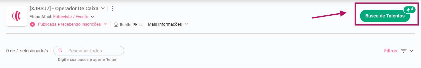 A Busca de Talentos traz candidatos com base na sugestões da IA e permite uma varredura no Banco de Talentos da sua conta, com base em filtros definidos.