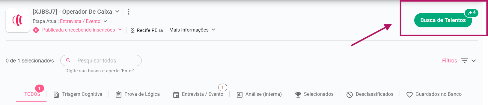 No canto superior direito do painel, você encontrará o botão "Busca de Talentos". Ao clicar nele, uma nova aba será aberta com uma busca de candidatos relacionada à sua oportunidade. Esses candidatos já estão cadastrados em outras oportunidades ou diretamente no banco de talentos da sua conta.