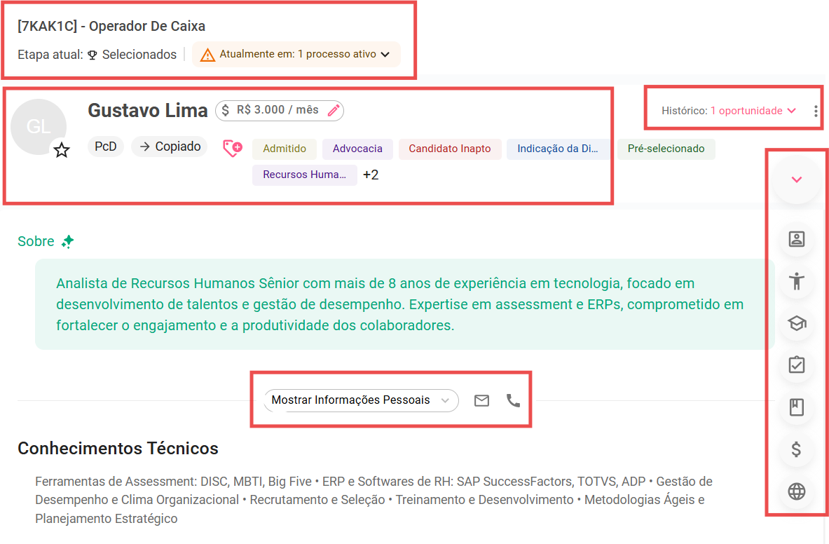 2- Já do lado direito do card do candidato, você irá encontrar: