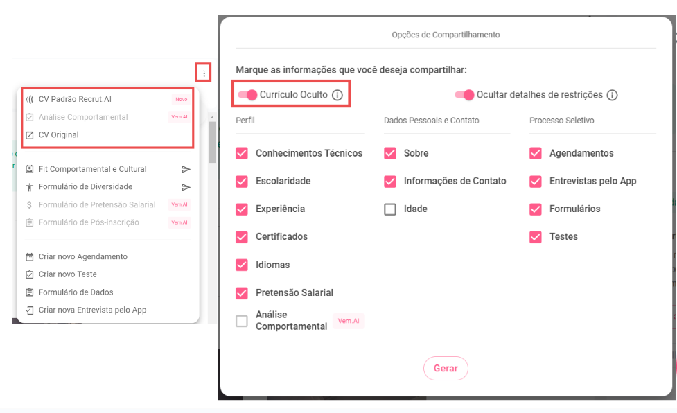 - Menu (três pontinhos) com ações para compartilhar, copiar ou restringir o candidato)