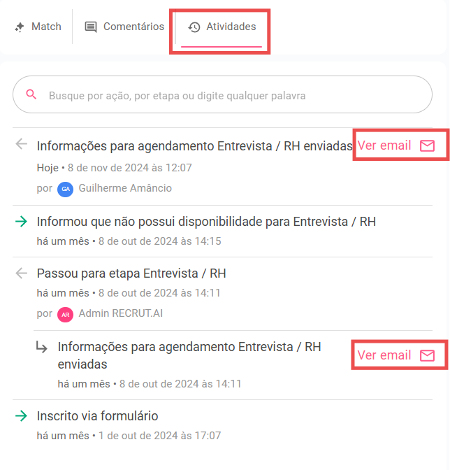 No campo “Atividades” você terá acesso inclusive ao texto enviado no email para o candidato, garantindo assim toda a rastreabilidade do processo.