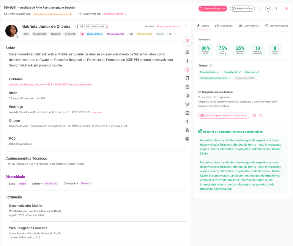 Com uma visão completa destacando todos os diferenciais daquele candidato, o card deixar sua avaliação muito mais rápida. Basta bater o olho no candidato e você já terá identificará um grande resumo de todos os pontos importantes. Confira!
