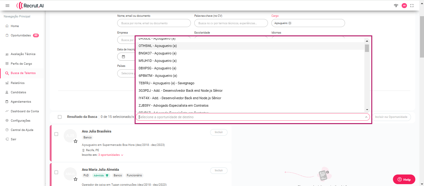 No exemplo, buscaremos por candidatos com perfil de "Açougueiro", depois de realizar a busca é só indicar Qual oportunidade de destino o seu candidato será incluso: