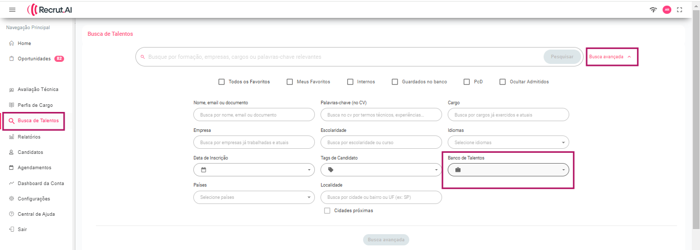 Na busca Busca de Talentos você pode usar a Busca Avançada para para indicar qual o Banco de Talentos você realizará a busca pelo candidato: