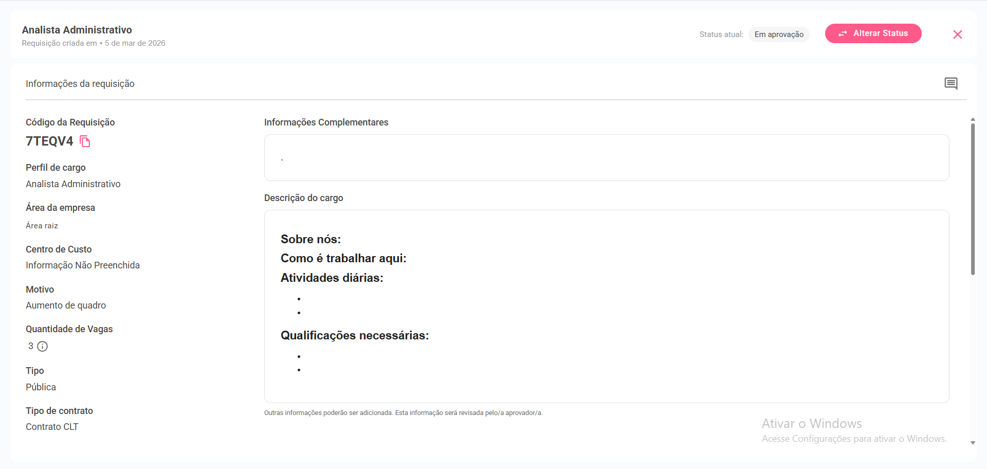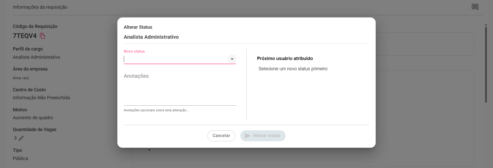 O campo de anotações será exibido, junto com o botão de alterar status, ao clicar no botão a requisição será movida para a aba de “Aprovada” na seção de requisição de vagas e também em Oportunidade, onde o Gerente de RH poderá atribuir um recrutador. Saiba mais sobre essa etapa do fluxo clicando aqui.