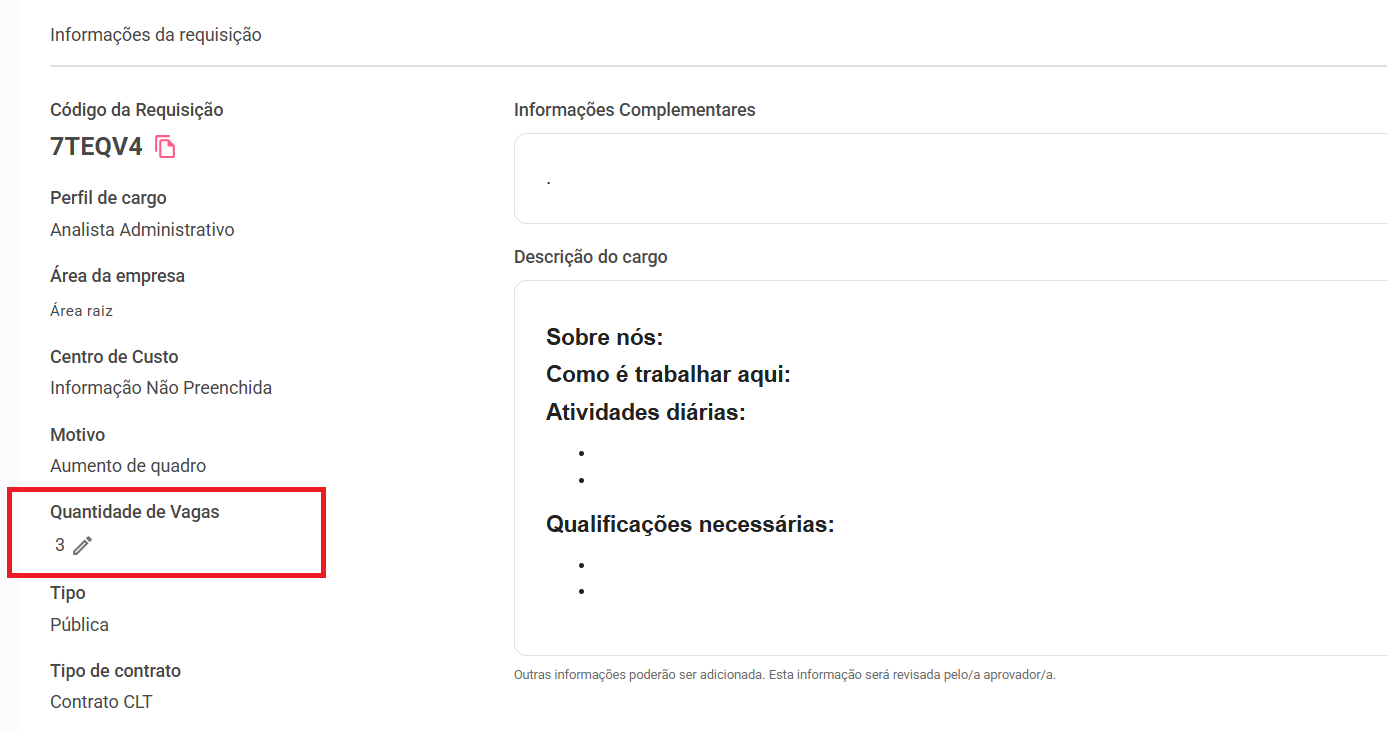 Código da Requisição, Perfil de cargo, Área da empresa, Centro de custo, Motivo, Quantidade de Vagas, Tipo de Vaga, Forma de contratação, Informação Salarial, Modalidade, Horário de trabalho, Vaga exclusiva para PCD, Localização, Informações complementares e a Descrição do cargo. Você pode encontrar todas estas informações na barra lateral.