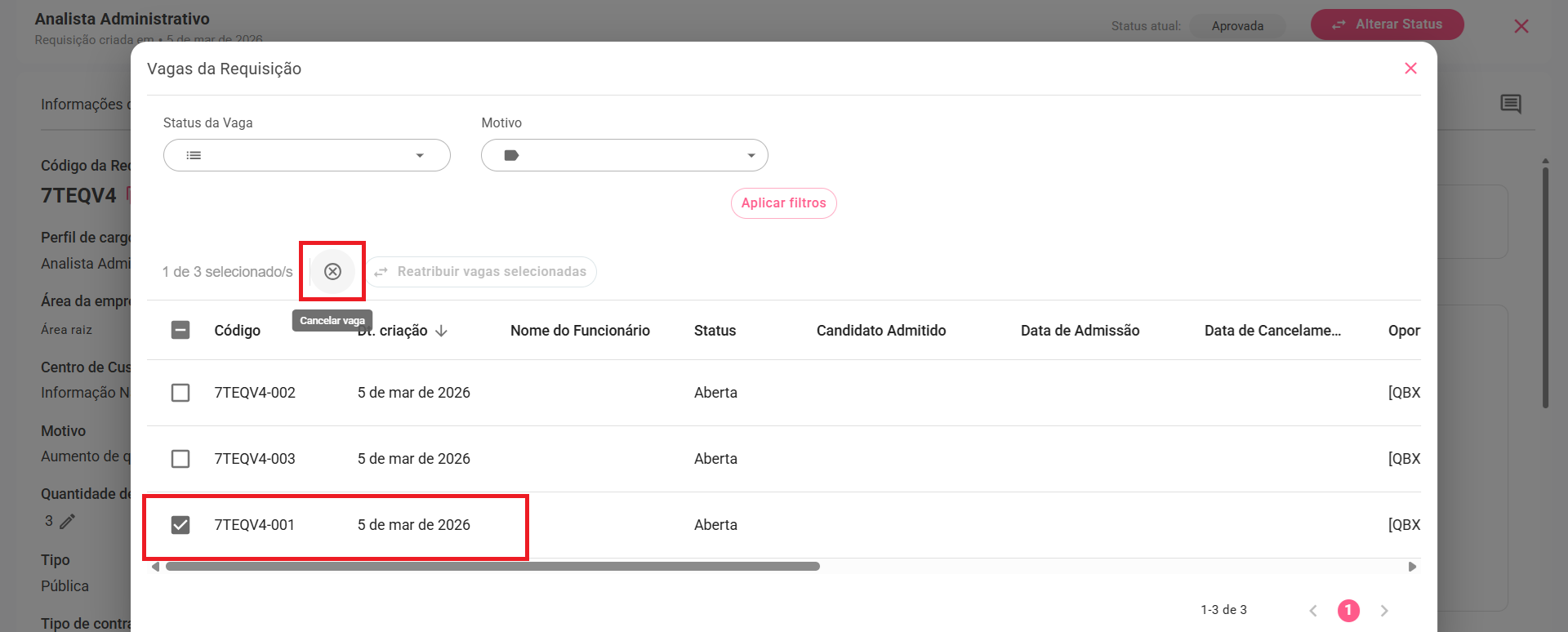 Após clicar, aparecerá um card mostrando as vagas da requisição e um botão que mostra a opção de cancelar a vaga selecionada. Acima, há o campo de filtro de vagas abertas, não preenchidas e canceladas. Ao lado deste campo, há um campo para filtrar o motivo, sendo opcional.