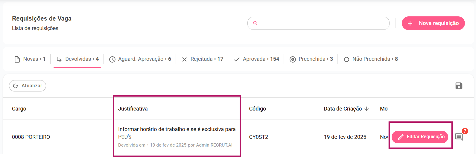 São as requisições que foram enviadas para aprovação, mas foram devolvidas pelos aprovadores. Isso ocorre quando o aprovador precisa que a solicitação seja alterada ou ajustada por algum motivo, ou justificativa específica.