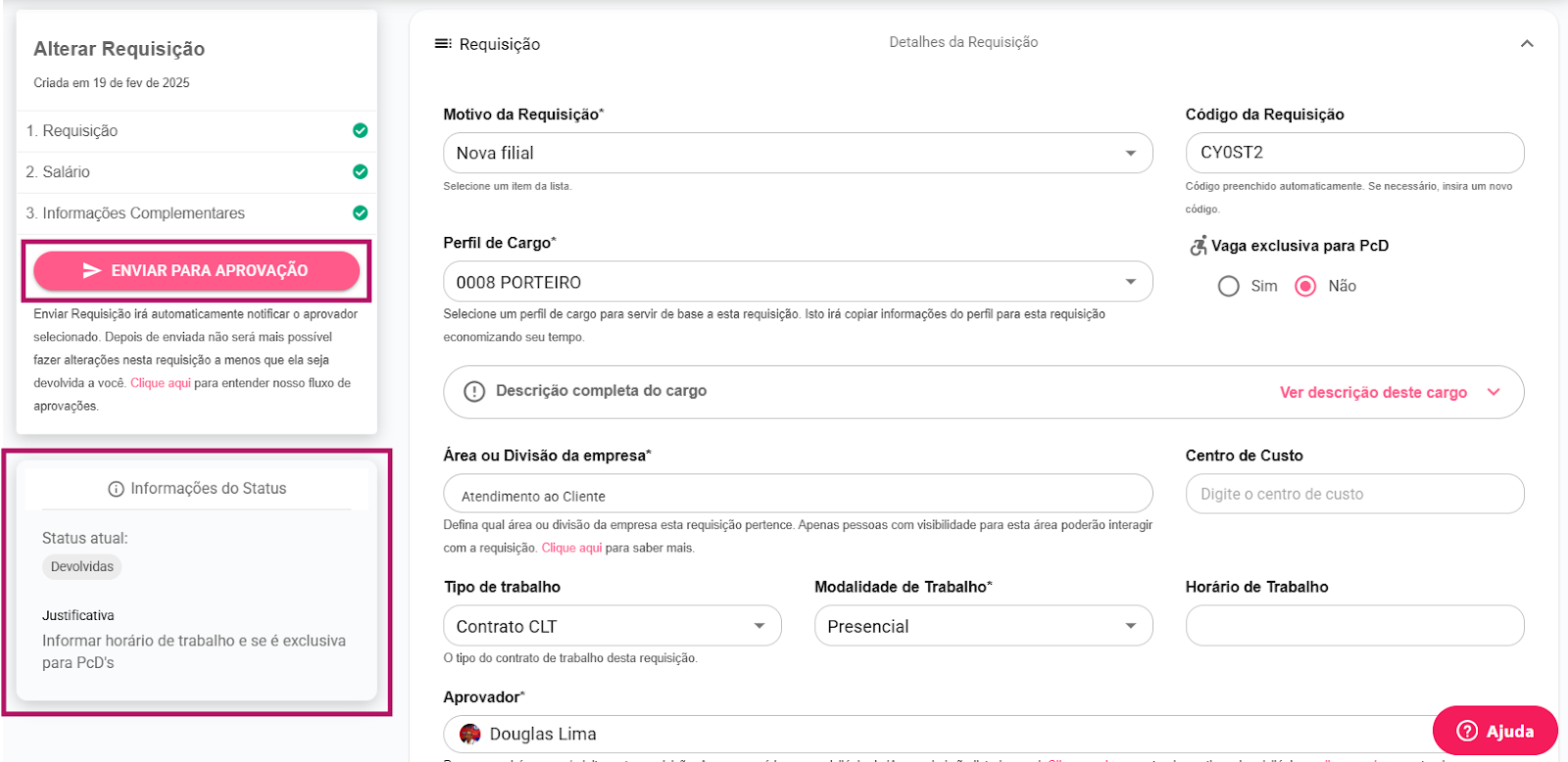Código da Requisição, Perfil de cargo, Área da empresa, Centro de custo, Motivo, Forma de contratação, Informação Salarial, Modalidade, Horário de trabalho, Vaga exclusiva para PCD, Localização, Informações complementares e a Descrição do cargo.