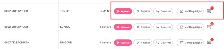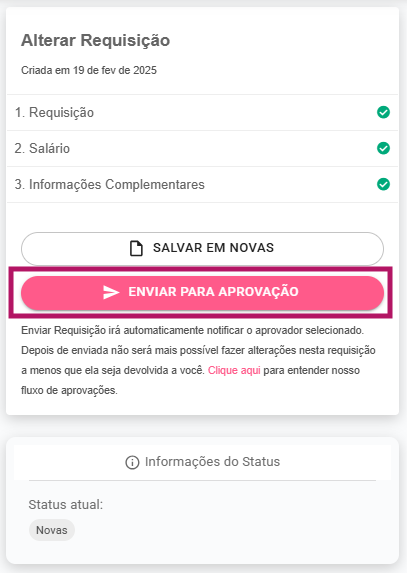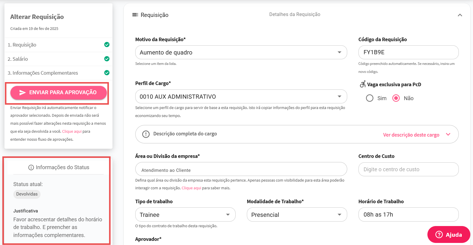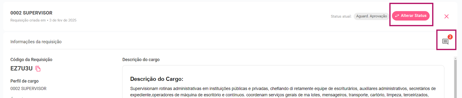 Também nesta tela, é possível para o aprovador, admin ou gerente de RH, alterar o status da requisição usando o botão “Alterar Status” e verificar se há comentários.