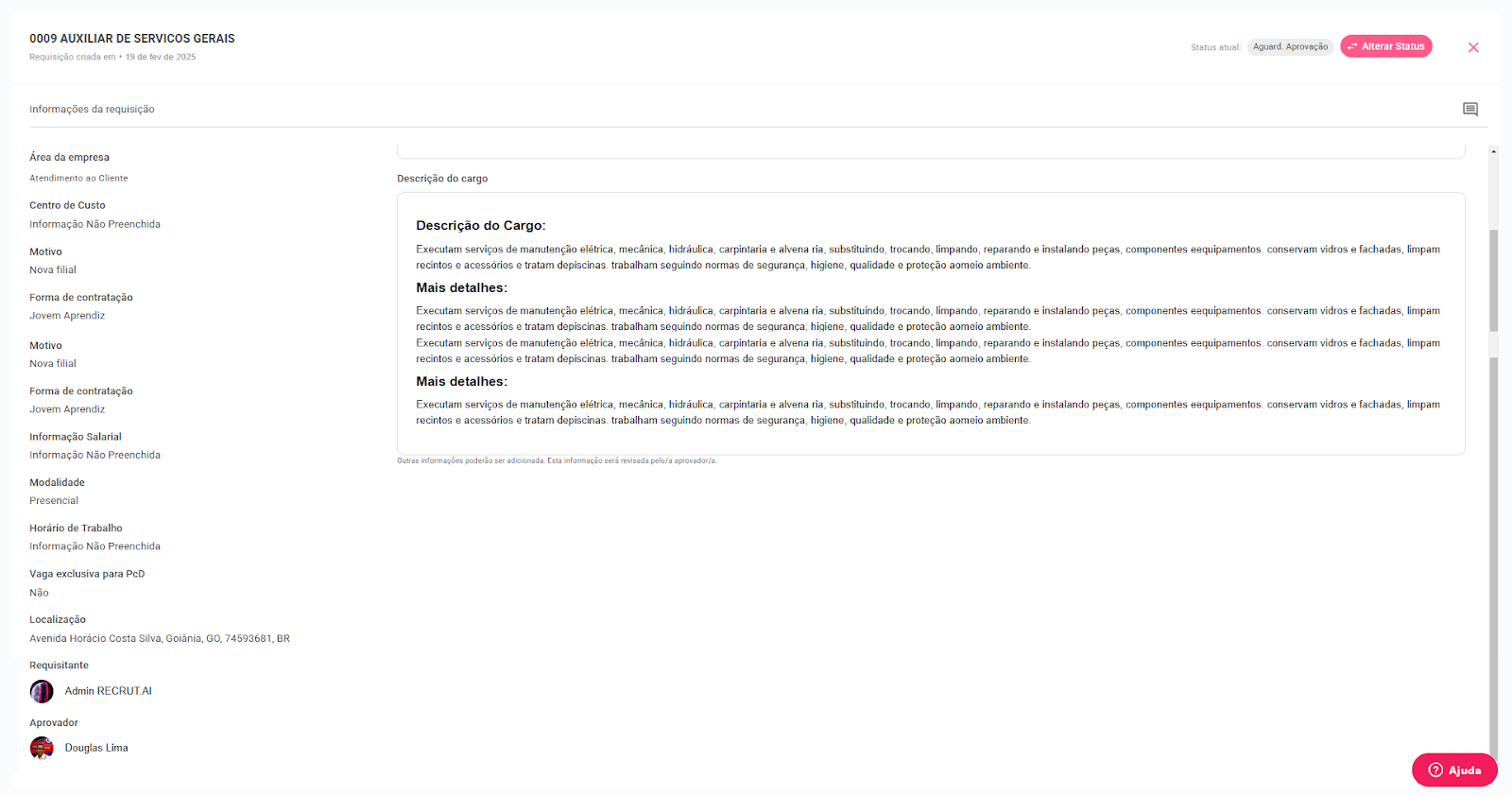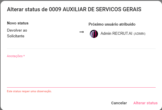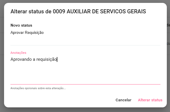 O campo de anotações será exibido junto com o botão de alterar status, ao clicar no botão, a requisição será movida para a aba de “Aprovação” na seção de Requisição de Vagas e também em Oportunidades, onde o Administrador poderá atribuir um recrutador(a).