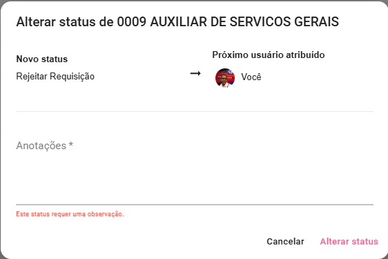 O campo de anotações será exibido, sendo obrigatório o preenchimento nesta vez para justificar o motivo da rejeição da requisição. Ao rejeitar, a requisição não irá poder mais ser alterada, sendo necessário a abertura de uma nova requisição.