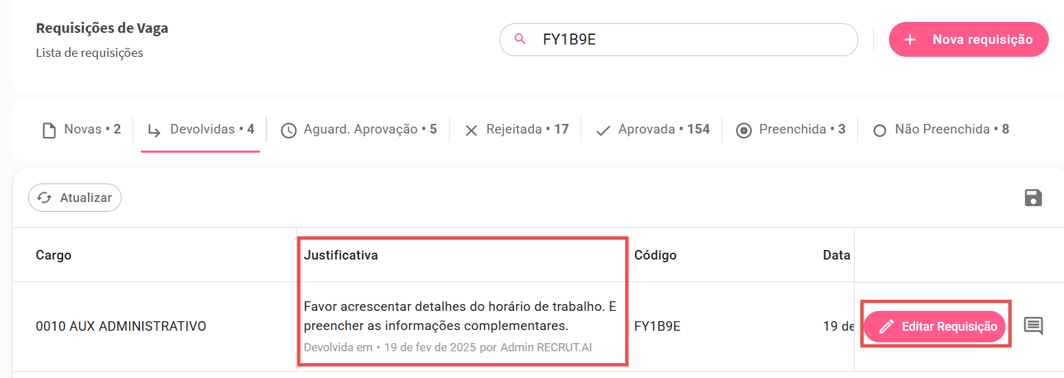 Ao clicar no botão “Editar Requisição”, o formulário de requisição irá se abrir para edições solicitadas. Nesta tela também será possível visualizar o status atual da requisição e a justificativa enviada pelo aprovador: