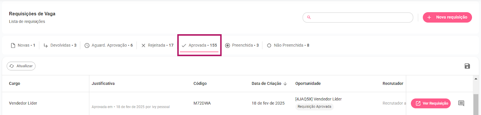 As requisições aprovadas já se tornaram uma oportunidade e você pode acompanhar o status da oportunidade na coluna “Oportunidade” na área de “Requisição Aprovada”. Veja mais detalhes aqui.