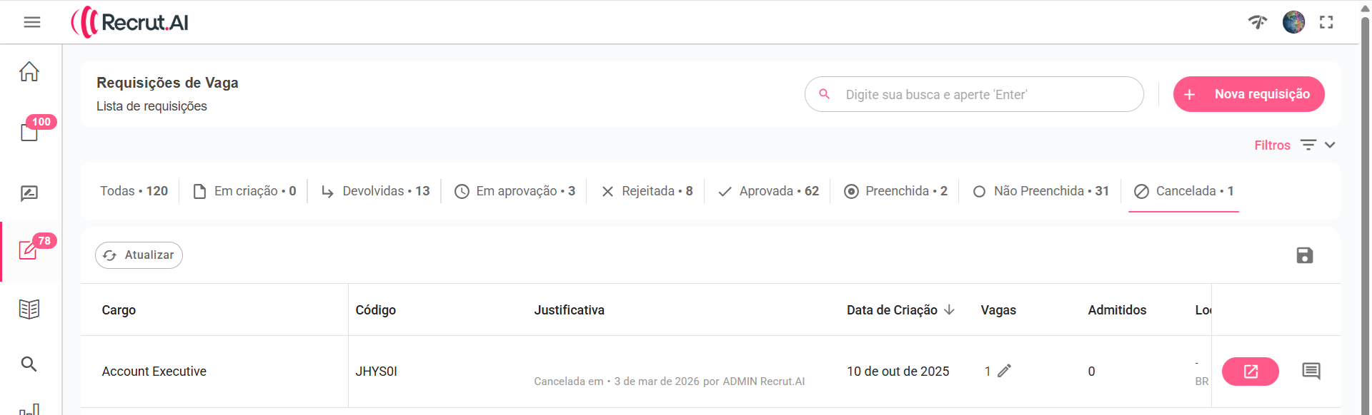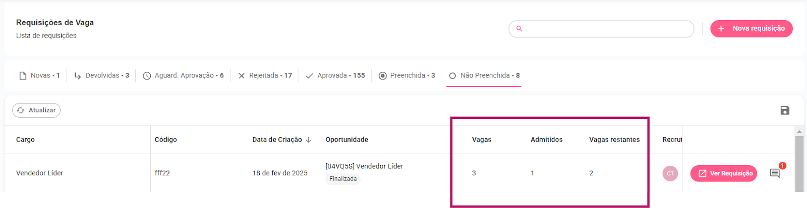 A oportunidade irá cair nessa aba quando, a requisição (agora oportunidade) tiver seu processo concluído, mas a quantidade de admitidos acaba sendo inferior à quantidade de vagas solicitadas na oportunidade.