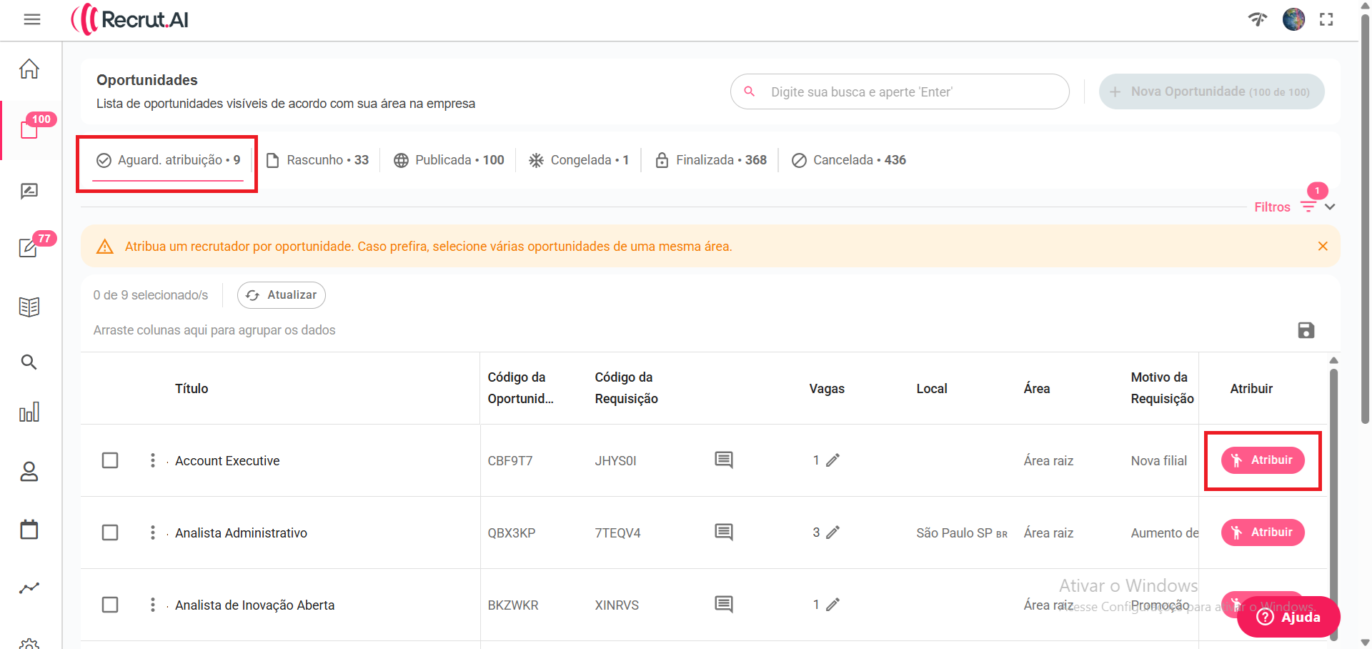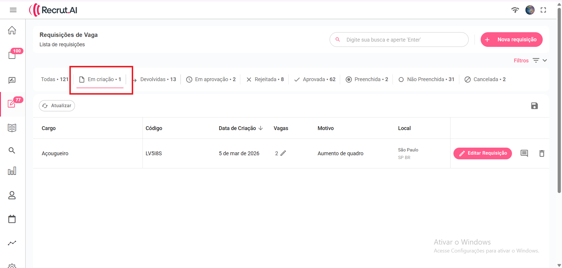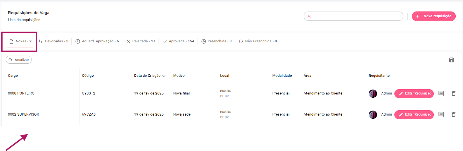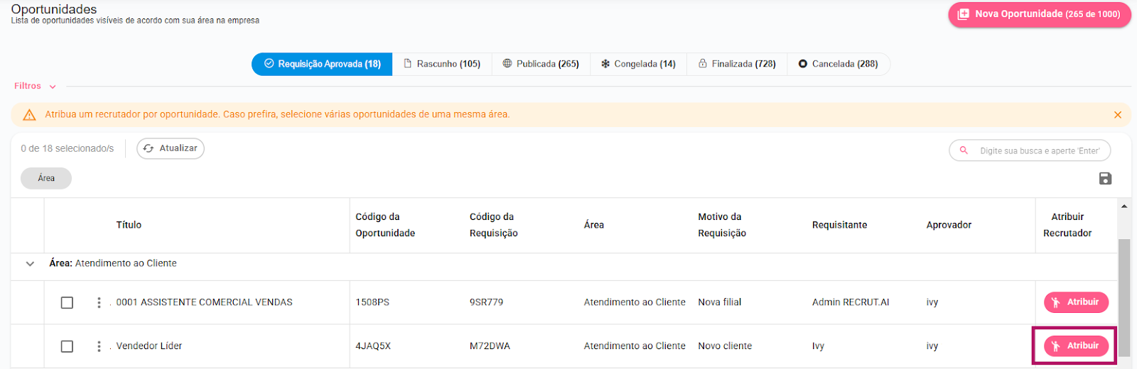 As requisições que foram aprovadas e estão aguardando a atribuição a um recrutador ou a publicação como oportunidade.