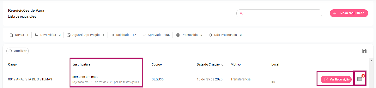 Toda requisição rejeitada tem uma justificativa e você também poderá verificar a requisição e ver comentários sobre este processo.
