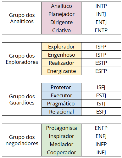 As 16 personalidades do MBTI são organizadas em quatro grandes grupos, cada um contendo quatro perfis distintos. Essa divisão facilita a interpretação do resultado, permitindo que recrutadores compreendam melhor as tendências comportamentais associadas a cada perfil.
