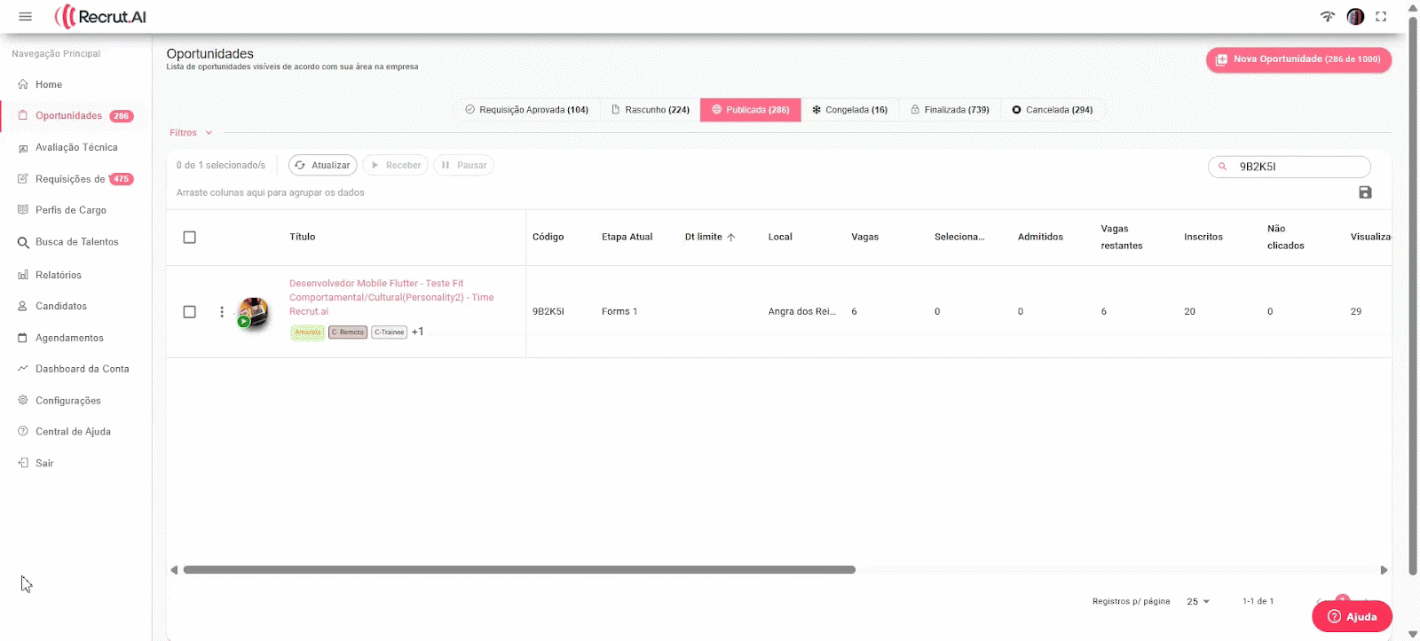 Para acessar, busque pela sua oportunidade no dashboard e acesse a oportunidade desejada. Localize o botão de filtro, no canto superior direito. Busque pelo filtro: “Perfil” e selecione qual o perfil do seu fit que você deseja filtrar.