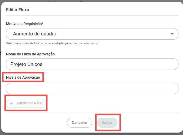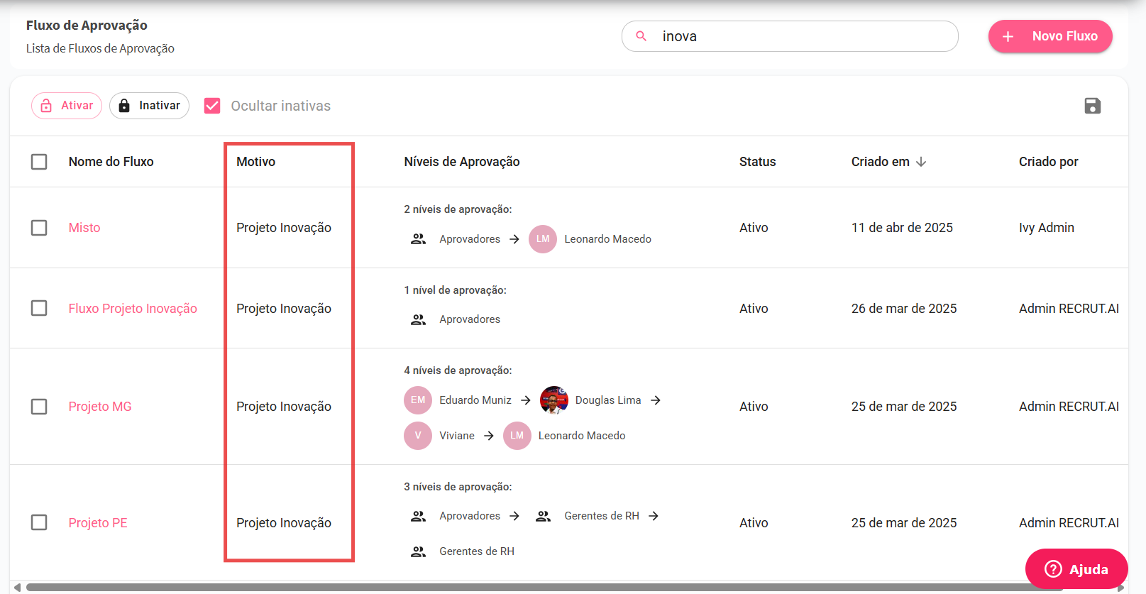 O fluxo de aprovação está obrigatoriamente associado a um dos motivos criados.