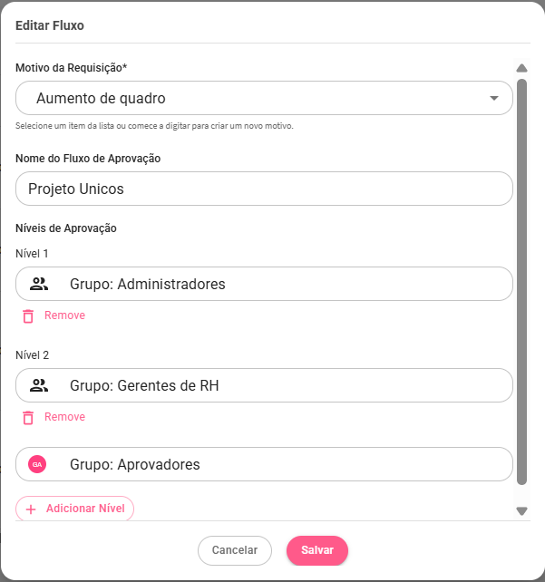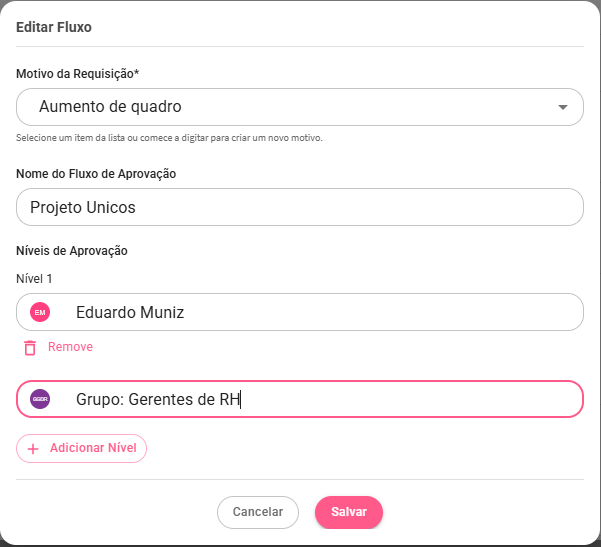 Somente grupos: São definidos somente grupos de usuários. Esses grupos podem ser de usuário Administradores, Gerentes de RH ou Aprovadores