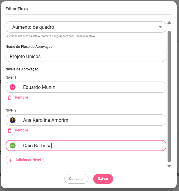 Aqui você definirá a quantidade de níveis e quais serão os usuários envolvidos.