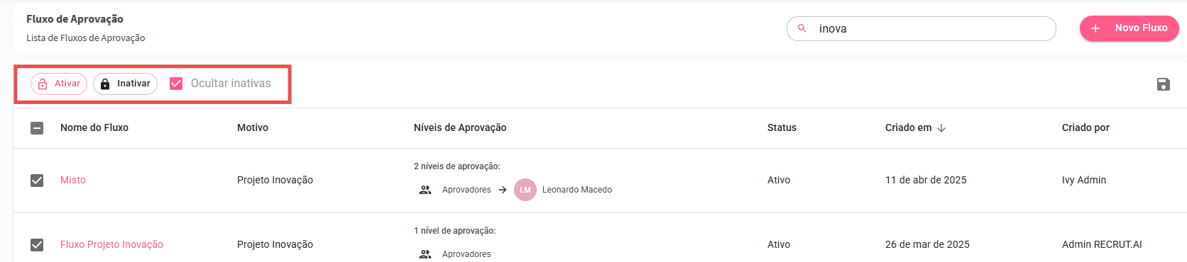 Ao clicar nessa opção, será exibida a tela com todos os fluxos de aprovação já cadastrados. No canto superior direito, clique no botão “+ Novo Fluxo”, destacado na cor rosa, para começar a configuração de um novo fluxo.