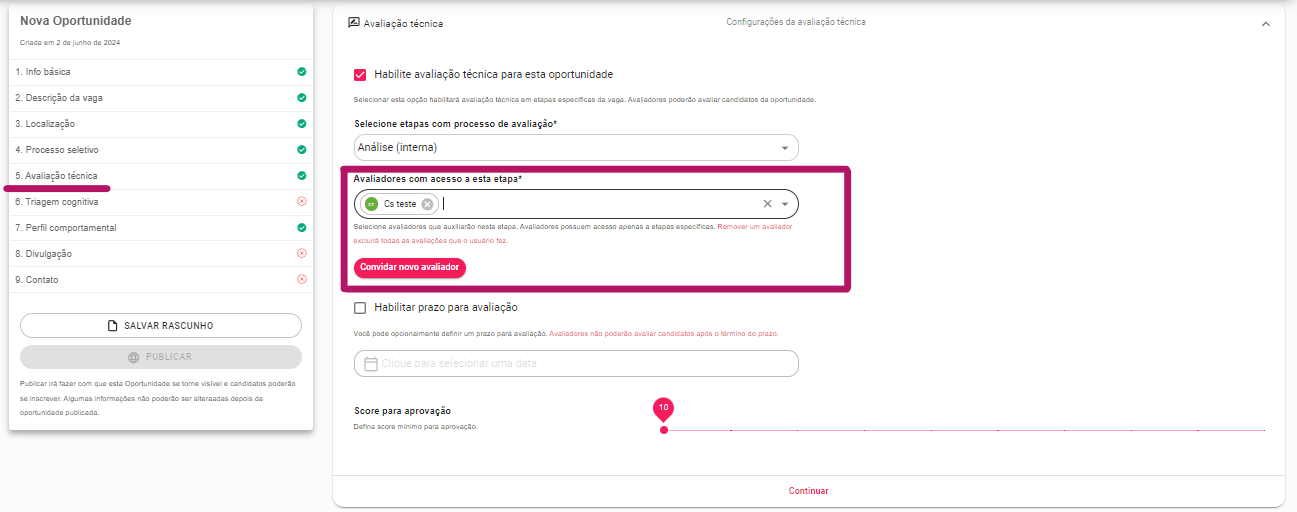 Nesta seção, você pode definir em quais etapas do processo seletivo será aplicada uma avaliação técnica e quem será o avaliador responsável.