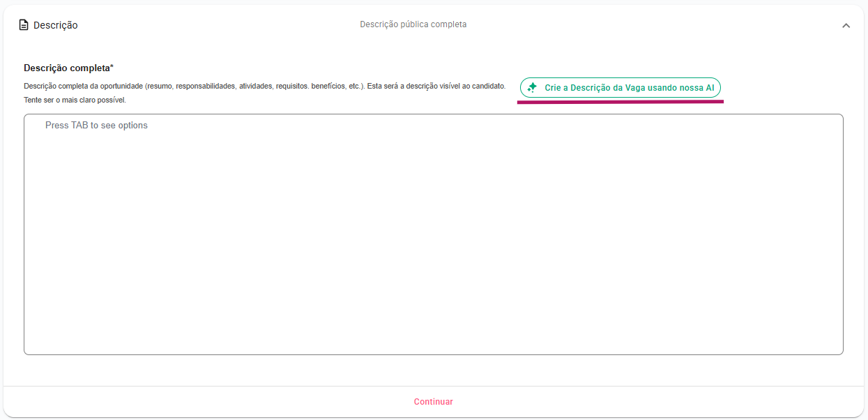 Esta seção é destinada à elaboração da Descrição Completa da oportunidade, que será apresentada aos candidatos quando acessarem o link de divulgação. Por isso, todas as informações relevantes para os candidatos devem constar aqui.