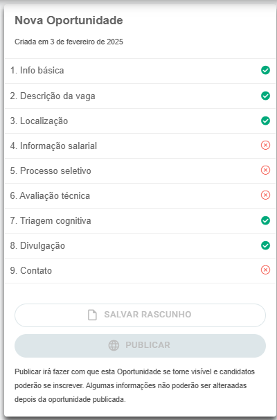 É necessário preencher pelo menos um campo da Triagem Cognitiva para que a oportunidade seja aberta. Quanto mais detalhado o preenchimento, mais eficiente será a seleção automatizada dos candidatos.