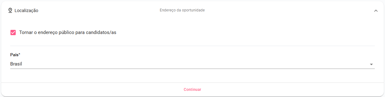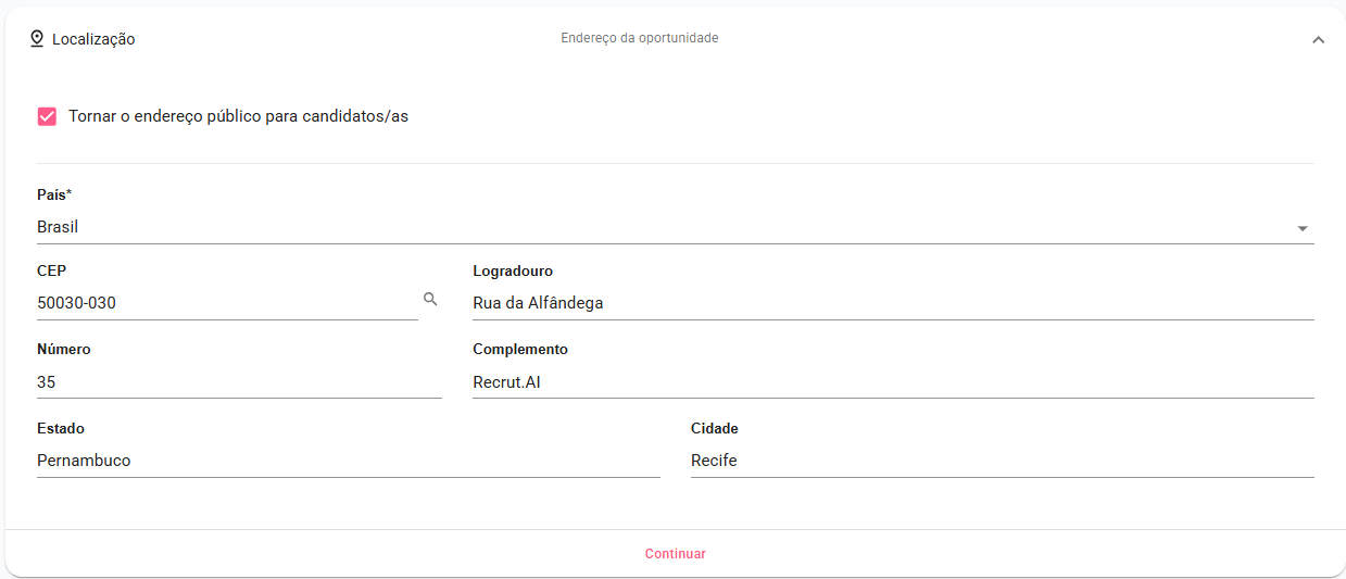Informe o local de trabalho dos contratados. Eles atuarão em uma função com atividades predominantemente externas? Os candidatos terão acesso ao endereço desse local? Essas informações serão inseridas nesta seção. Ao preencher o país e o CEP, alguns dados serão automaticamente completados. Você também pode optar por tornar o endereço público ou mantê-lo privado.