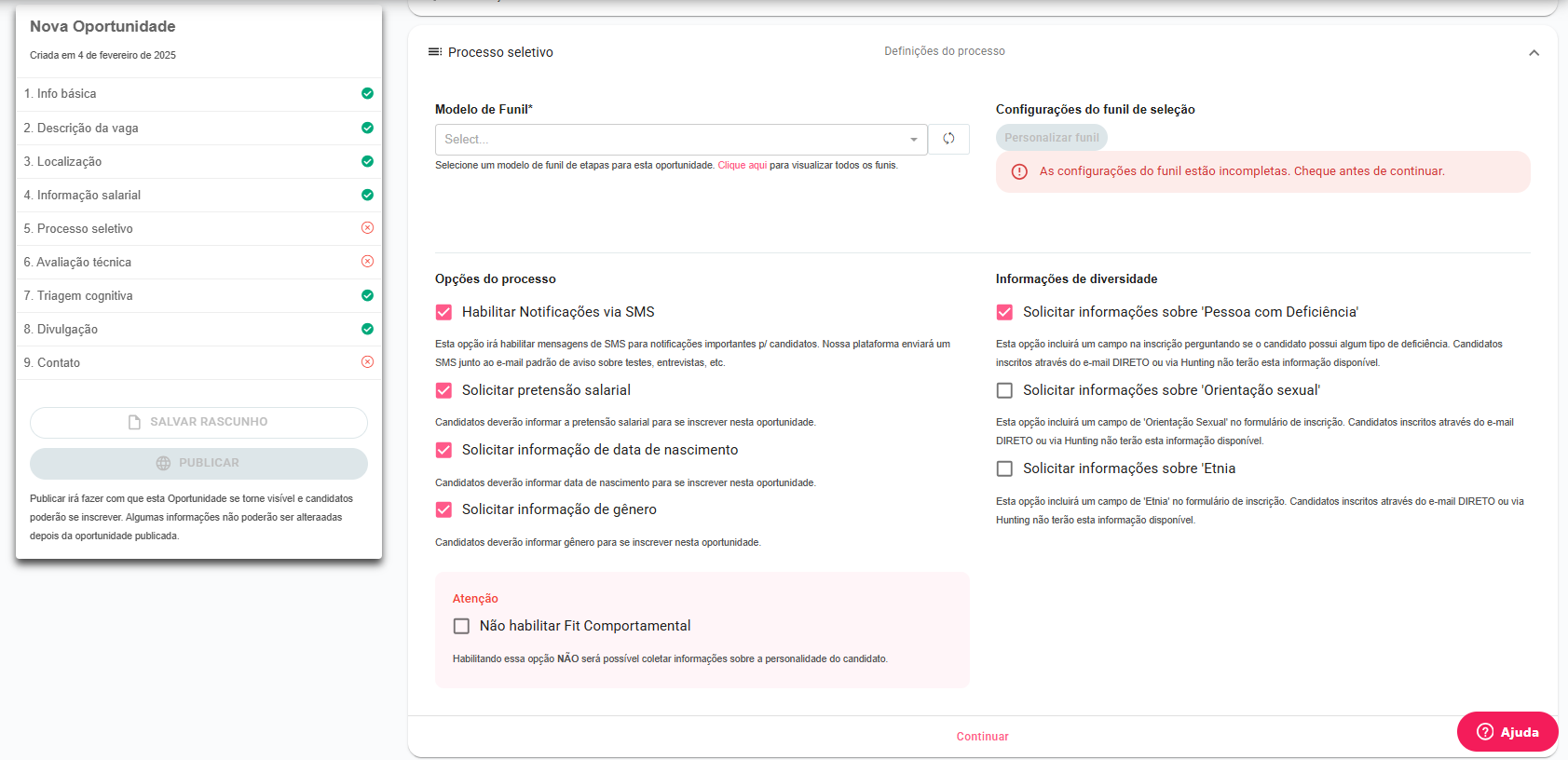 Nesta tela, você pode definir detalhes do processo seletivo e selecionar as informações que serão coletadas no formulário de inscrição dos candidatos. Aqui, estão disponíveis opções de personalização do funil de seleção, notificações, informações obrigatórias e dados de diversidade.