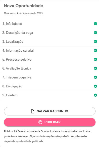 Por fim, todos os campos estarão preenchidos e você pode optar por salvar a vaga em rascunho ou publicá-la: