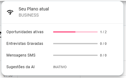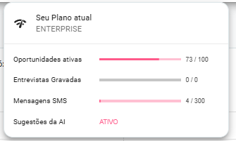 Nele, você conseguirá visualizar o tipo de plano contratado, a quantidade de oportunidades ativas, se o seu plano inclui entrevistas gravadas, mensagens SMS e se a função Sugestões da AI está ativa em sua conta. Ele aparecerá da seguinte maneira, conforme o exemplo:
