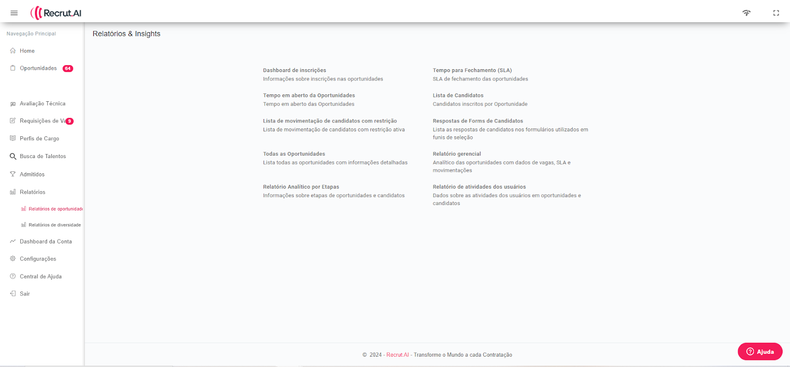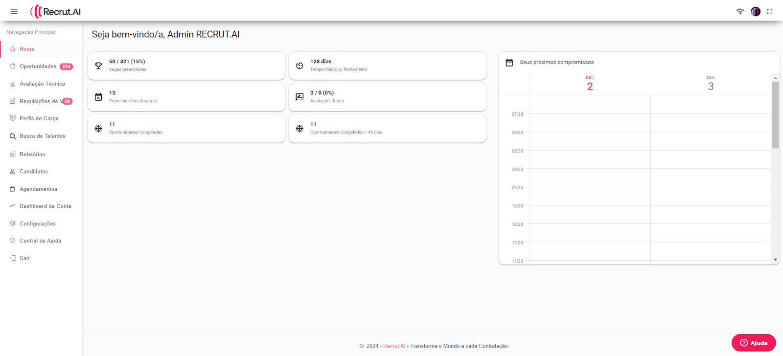 Esta é a nossa homepage ou página inicial, a primeira tela que você vê ao acessar sua conta na Recrut.AI. Nela, você encontrará um resumo das informações da sua conta, incluindo vagas preenchidas, processos fora do prazo, oportunidades congeladas, SLA de fechamento, avaliações feitas e oportunidades congeladas há mais de 45 dias.