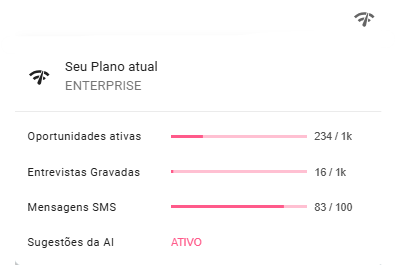 O ícone de Wi-Fi no cabeçalho fixo da plataforma exibe as informações sobre o uso e limites da sua conta. Ele mostra o tipo de plano, o número de oportunidades, vídeo entrevistas, mensagens SMS e créditos de Hunting, sempre indicando o quanto você já usou e o total disponível.