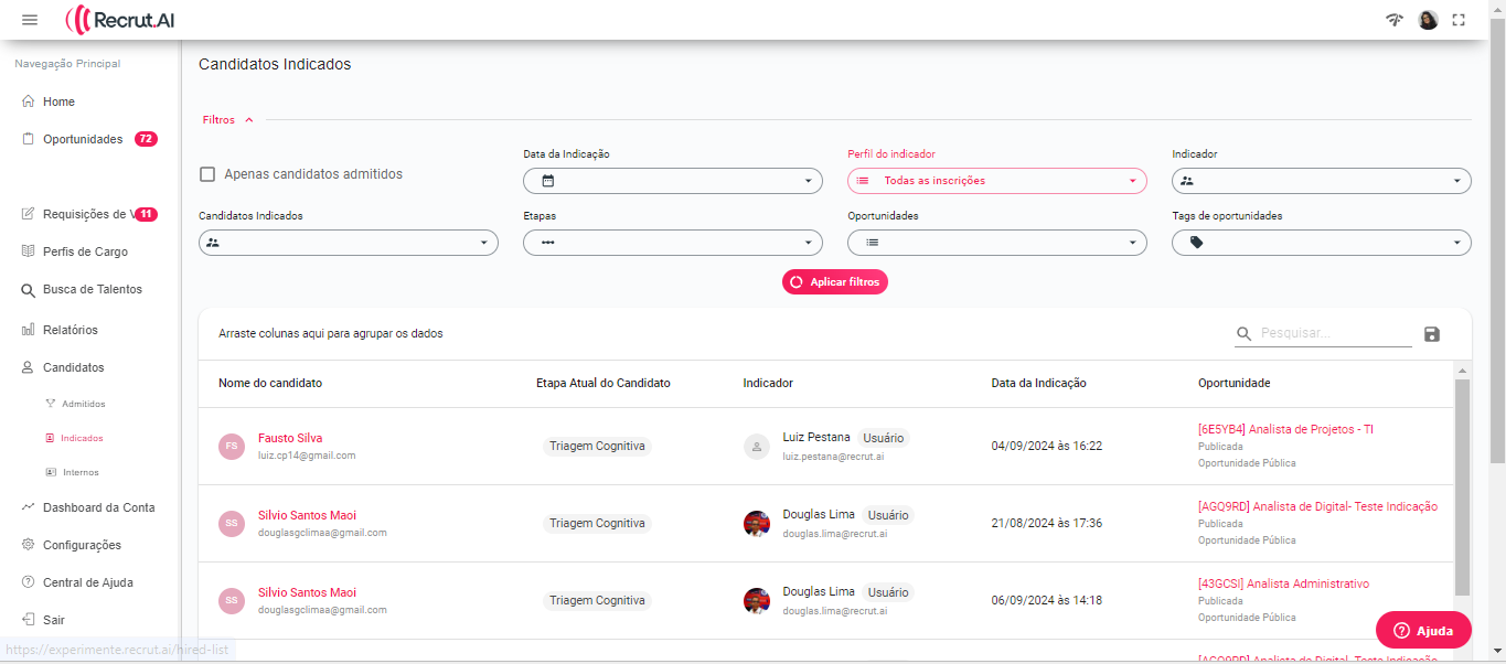 Nesta funcionalidade, você pode visualizar informações sobre os candidatos que foram indicados, candidatos que foram admitidos ou candidatos que foram uma lista de todos os candidatos que foram aprovados em processos seletivos na plataforma. Os filtros disponíveis permitem que você refine a busca: