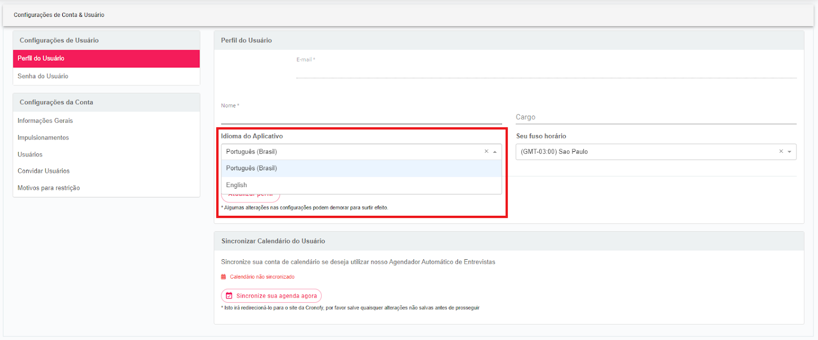 2. Já na aba de Perfil do Usuário, você terá a opção Idioma do Aplicativo e poderá escolher entre Português BR e Inglês.