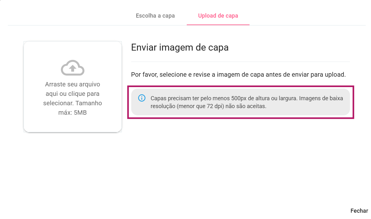 4. Clique em "Selecionar imagem de capa" e escolha a partir das imagens que já estão carregadas na plataforma, ou envie uma nova imagem clicando em "Upload de capa"