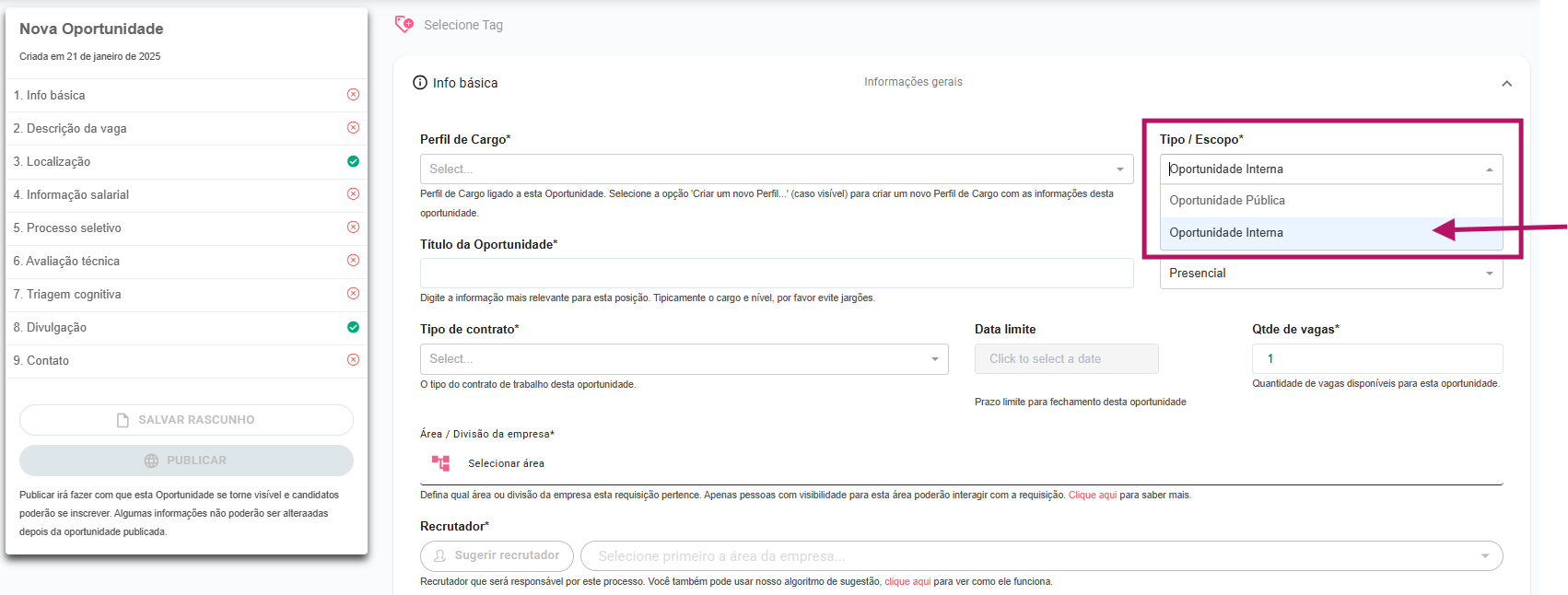Para divulgar suas vagas internas na Página de Carreiras, é necessário configurar a oportunidade como "Interna" no campo de tipo/escopo durante sua criação, na seção 1. Dessa forma, a vaga será exibida apenas na Página de Carreiras definida, sem ser compartilhada com parceiros ativados ou job boards.