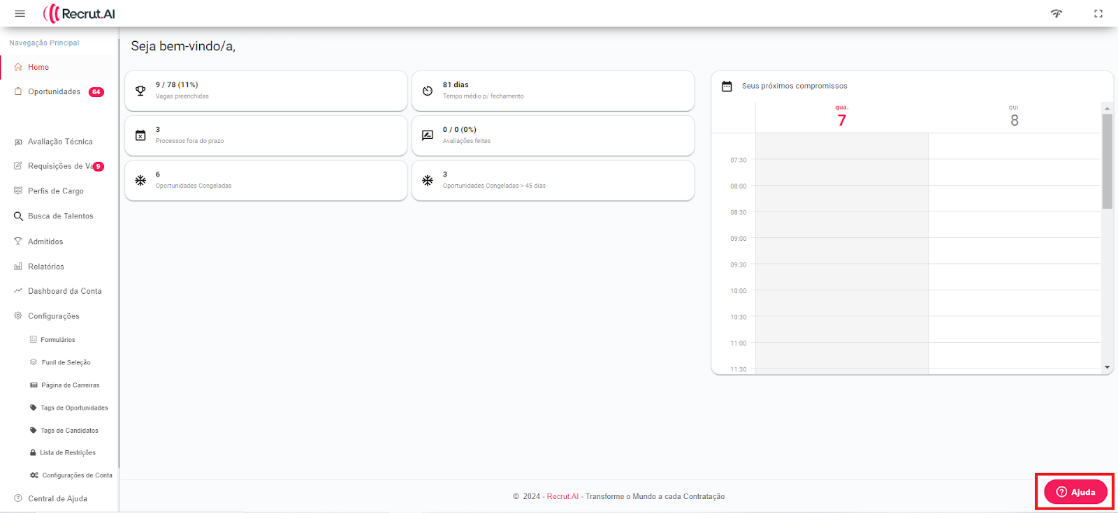 Para solicitar ajuda ao nosso suporte, clique no botão de ajuda, que está localizado no canto inferior direito da plataforma. Veja o exemplo na imagem abaixo: