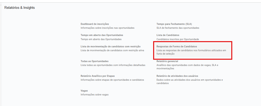 No menu "Relatórios" também é possível extrair o relatório das respostas dadas pelos candidatos das etapas de formulário que tenham sido realizadas. Nesse caso você irá verificar as respostas de cada um dos forms aplicados.