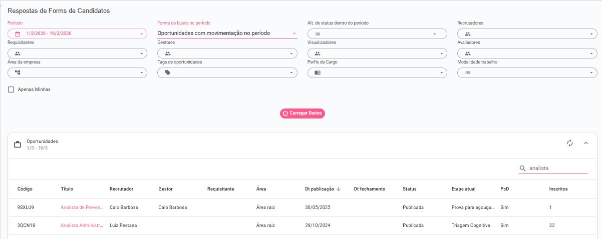 3-Organize os filtros de acordo com a busca desejada e busque pela vaga desejada no botão de pesquisa e selecione a oportunidade que deseja avaliar as respostas. Você pode também usar o campo de pesquisa para buscar pelo nome ou código específico da oportunidade.
