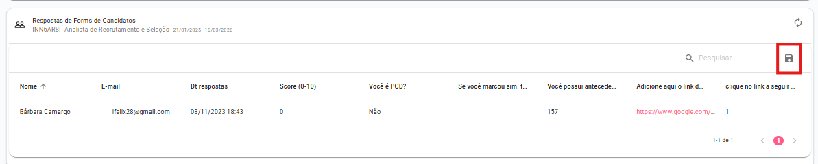5-Em seguida a lista com as respostas dos candidatos irá aparecer. Você irá encontrar o nome do candidato, o email, a nota atingida naquela etapa (score) e a respostas das perguntas tipo aberta e tipo fechada que foram colocadas no formulário. Para exportar o relatório basta clicar no disquete que consta ao lado do campo de pesquisa: