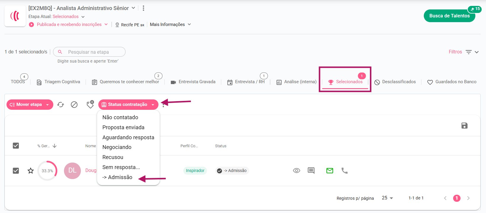 Atenção: Os candidatos selecionados só aparecerão no campo de "selecionados" se você tiver alterado o status dele nessa etapa para "Admissão"