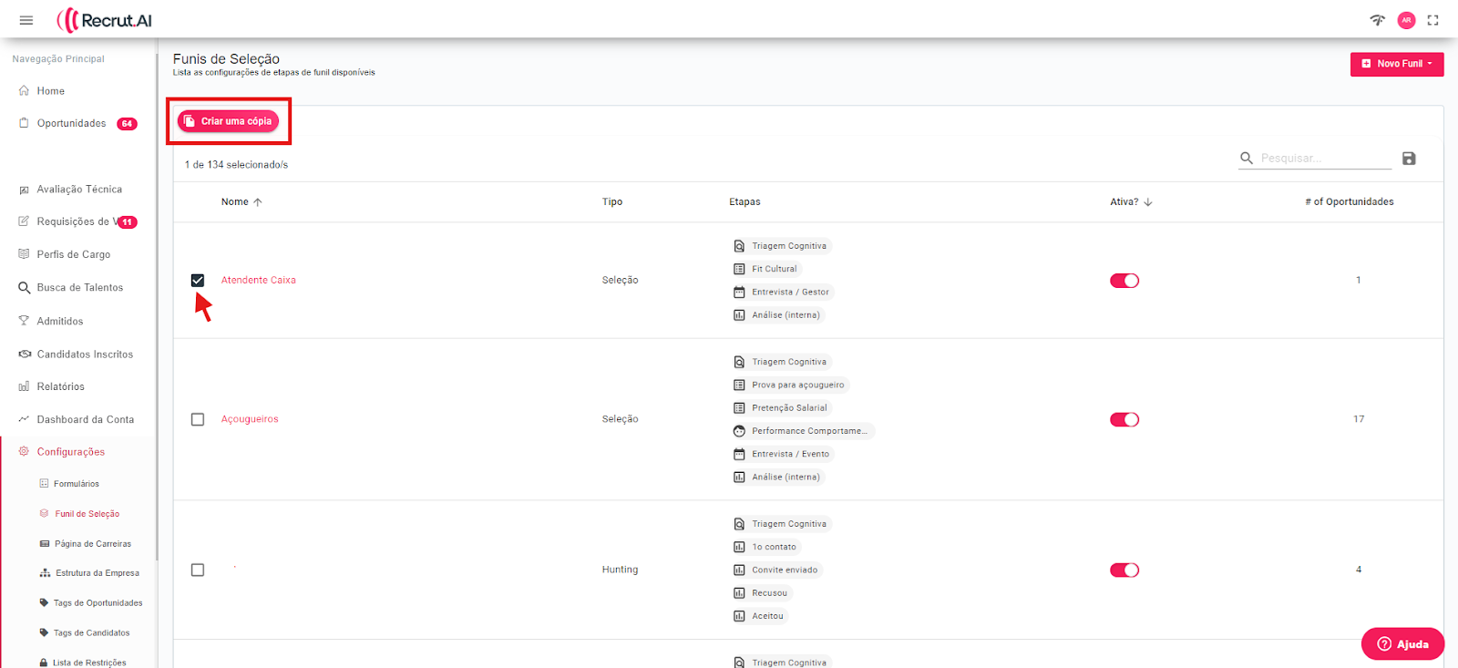 Para facilitar a montagem do seu funil de seleção, você pode criar cópias de um funil "base" existente. Basta selecionar o funil desejado e clicar no botão "criar uma cópia" na parte superior da tela.
